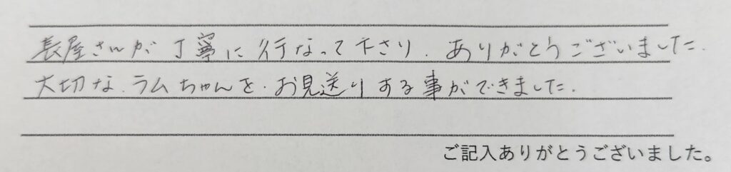 残暑が厳しいですが、少しずつ過ごしやすい時間帯も増えてきましたね。とても骨格のしっかりした子で、見晴らしのよい場所からお見送りする事ができました。今頃は虹の橋でラムちゃんと再会し、一緒にご家族様を見守られているのではと思います。