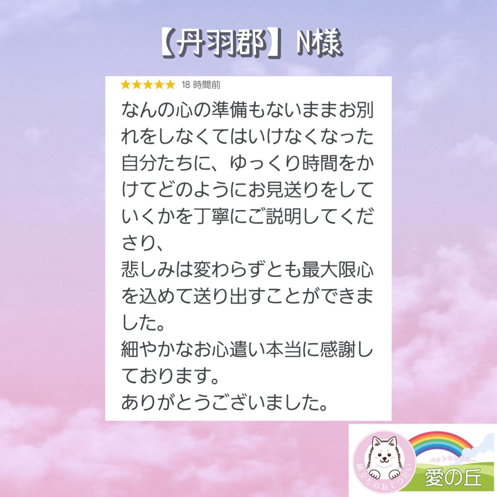 何の心の準備のないままお別れをしなくてはいけなくなった自分たちに、ゆっくり時間をかけてどのようにお見送りをしていくかを丁寧にご説明してくださり、悲しみは変わらずとも最大限心を込めて送り出すことができました。