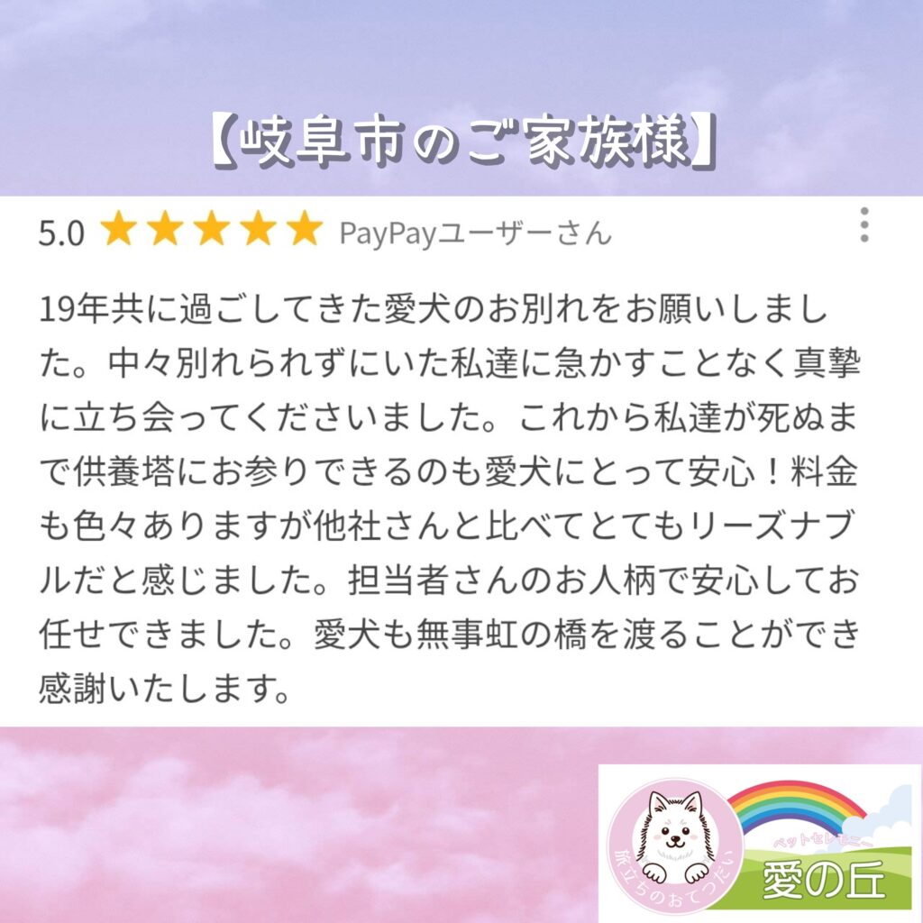 担当者さんのお人柄で安心してお任せできました。愛犬も無事虹の橋を渡ることができ感謝いたします。