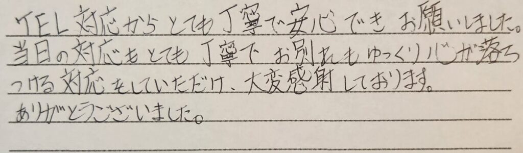 私たちの大切な家族の死に直面して、気が動転している中での丁寧な電話対応で少し落ち着きを取り戻せ、また、当日のお別れに際してもゆっくりと時間を設けていただき、しっかりと家族とのお別れをすることができました。